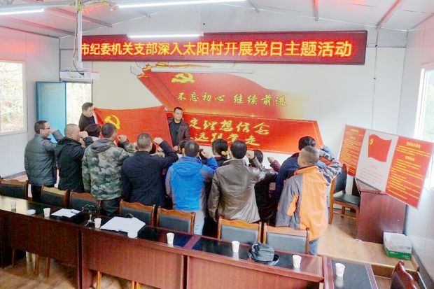市纪委向太阳村党支部赠送了20本《党章》、20本《党的十九大报告辅导读本》、50册党风廉政书籍;赴太阳村的全体党员与新添乡党委、太阳村村支两委、党员代表共同开展了主题党日活动,集体重温了入党誓词,与贫困户高丙超、石章贵共同召开了学习贯彻十九大精神、《党章》和省委十一届二次全会精神座谈会,大家结合贯彻讨论、交流了学习体会和认识,听取了太阳村脱贫攻坚工作情况报告,与贫困户就巩固深化帮扶工作和脱贫攻坚等进行了交流。